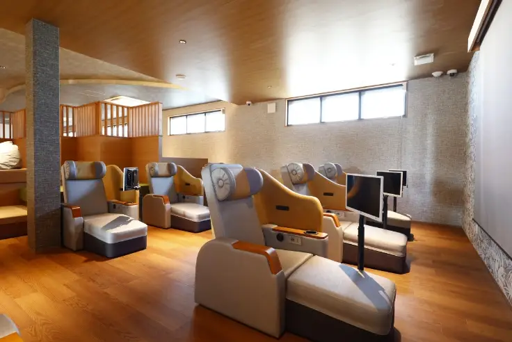 個別モニターを備えたリクライニングシートで、映画やテレビを見ながらご休憩いただけます。