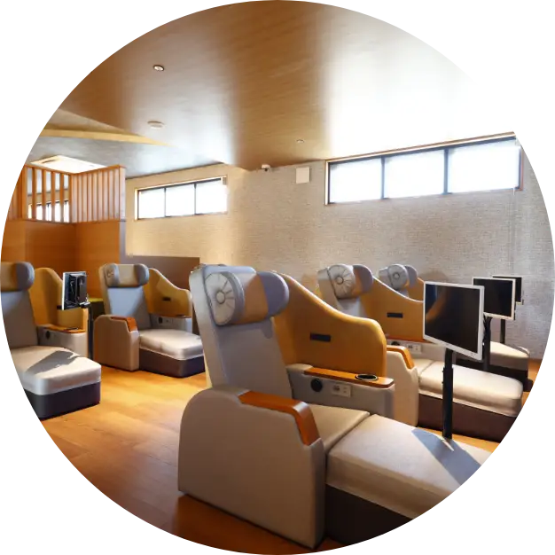 個別モニターを備えたリクライニングシートで、映画やテレビを見ながらご休憩いただけます。