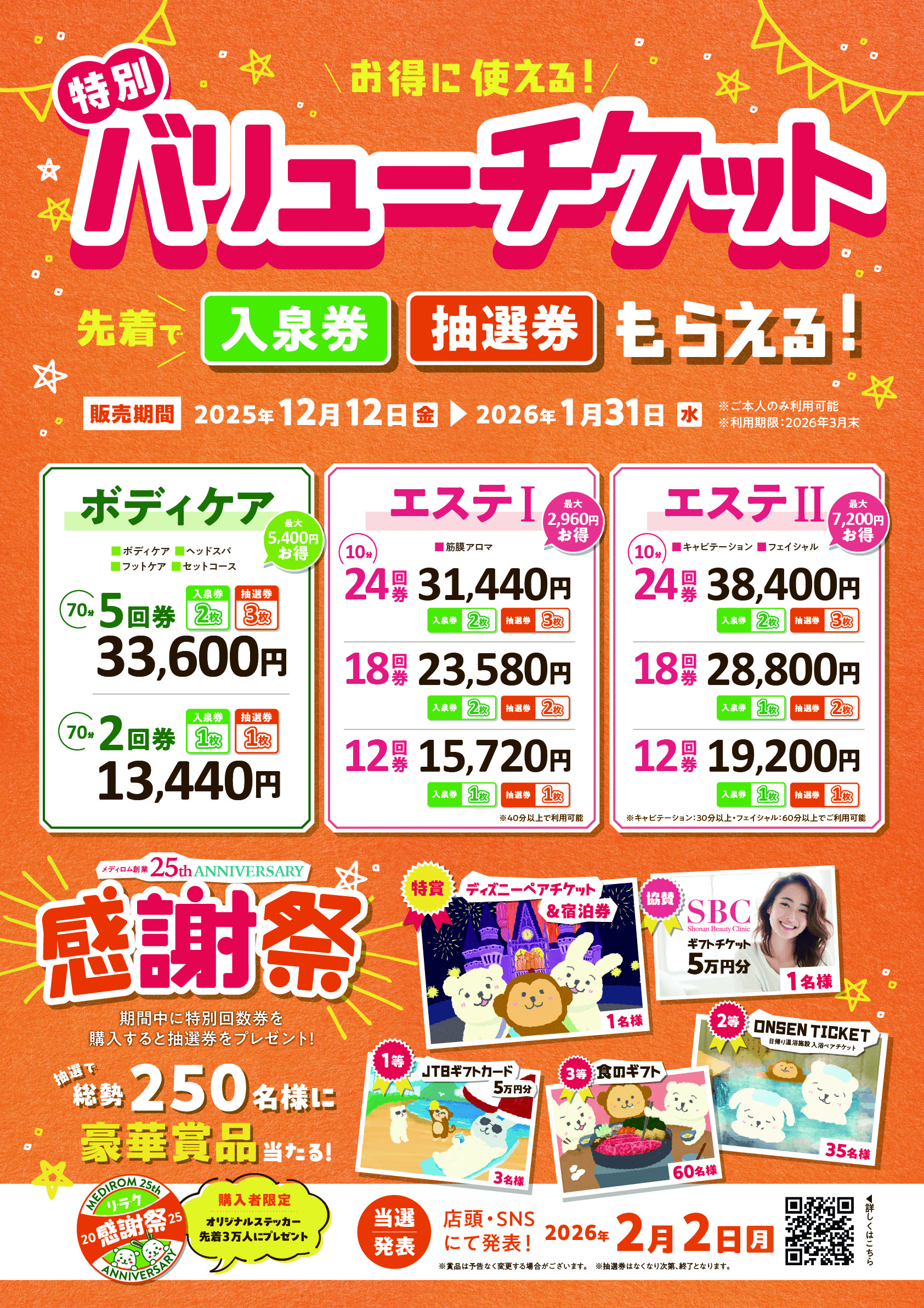 ・2回券:13,440円 ← 最大 2,160円お得!!(入泉券プレゼント1枚)
