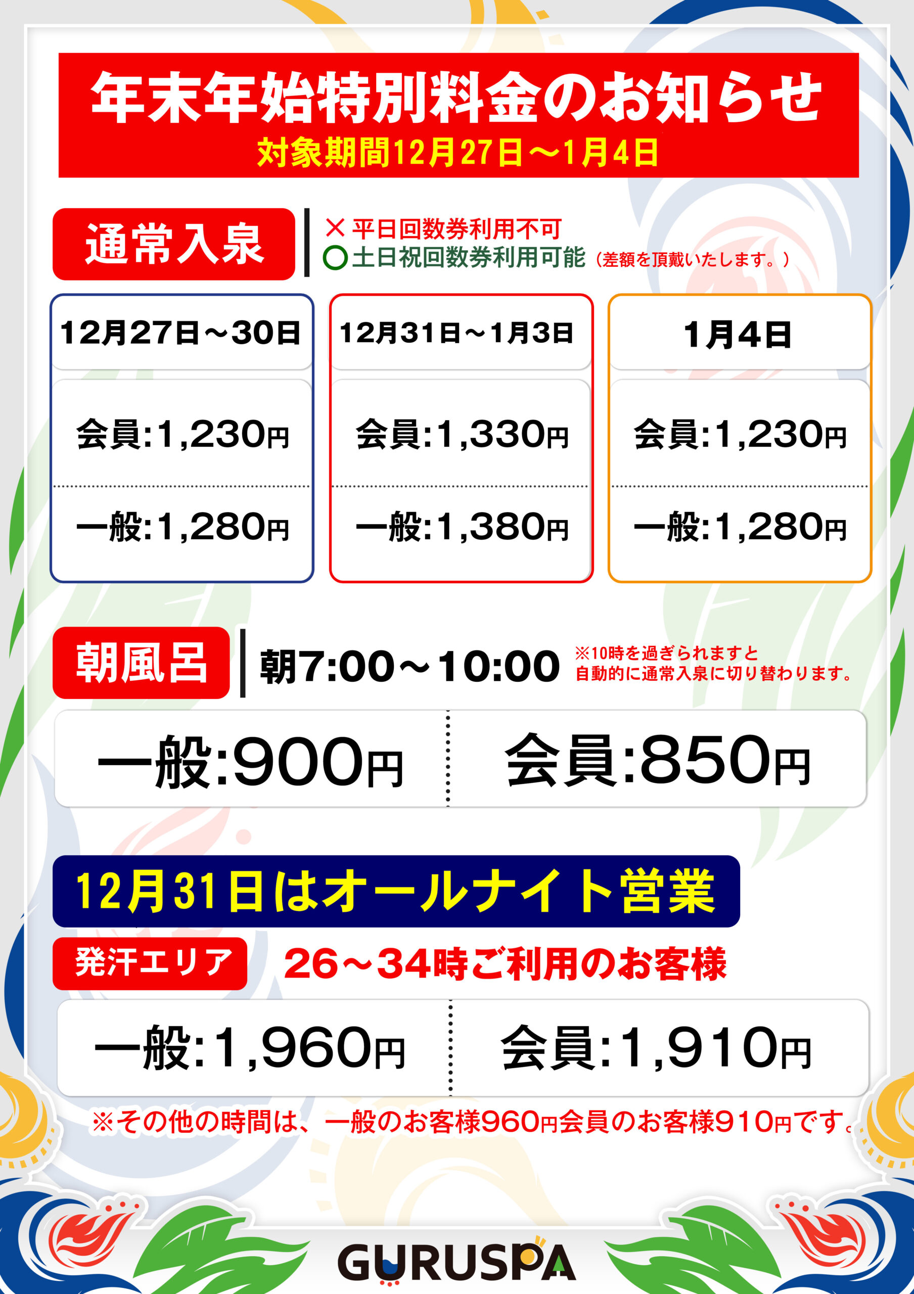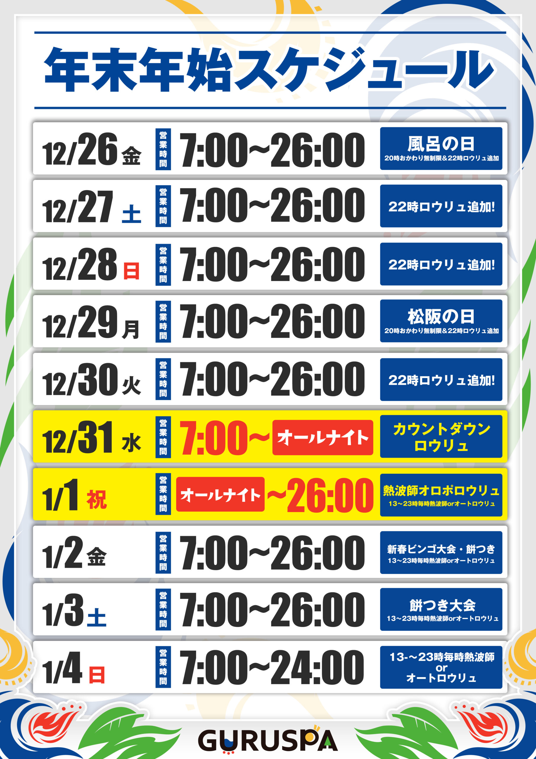ご案内 2025-12-26~2026-01-04 【12/27~】年末年始料金・スケジュール 年末年始特別料金のお知らせをいたします! 年末年始も休まず営業! 様々なイベントもご用意していますので、是非! 年末年始もグルスパへご来店ください! イベント情報へ戻る