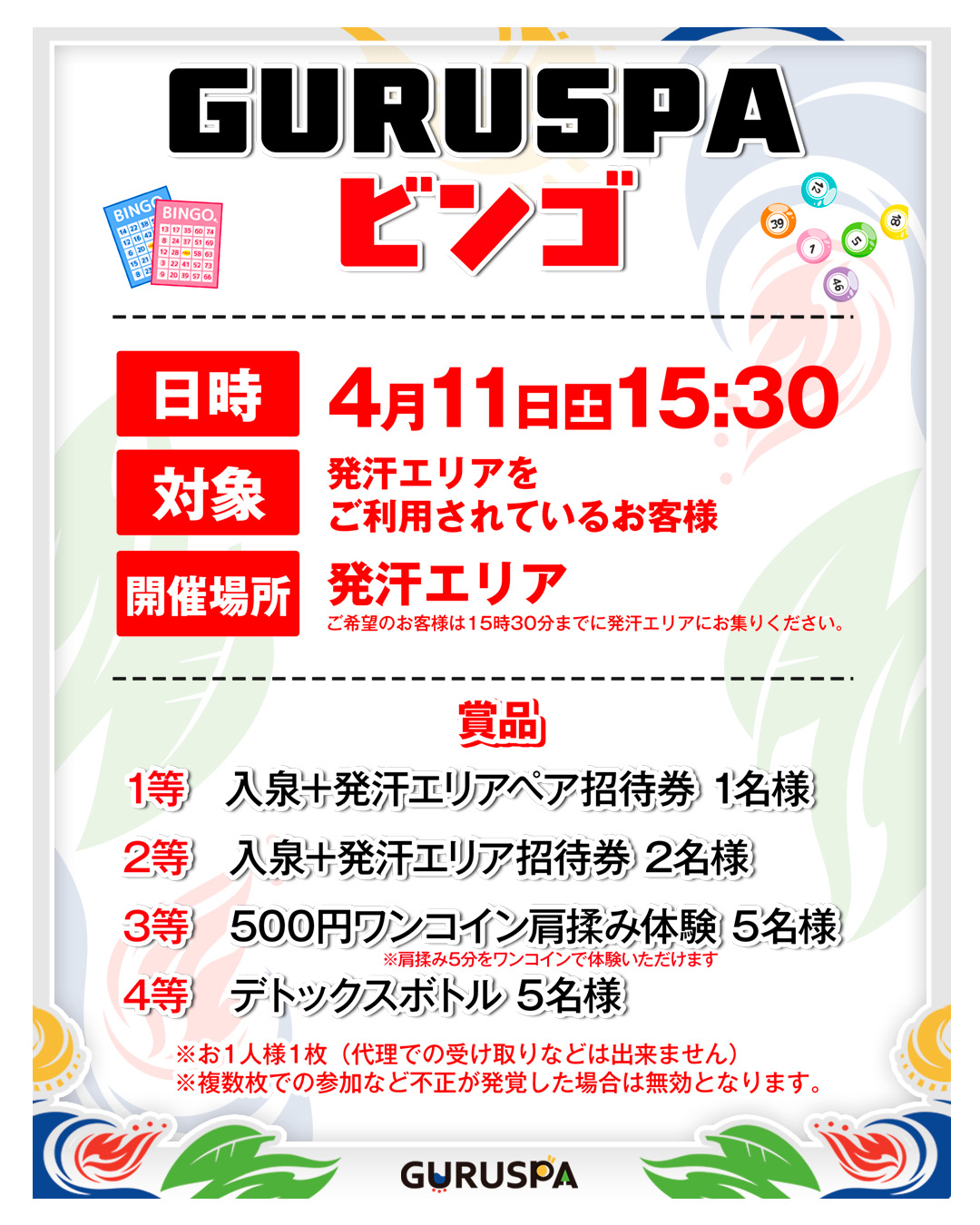 4月11日(土)15:30~ ビンゴ大会を開催いたします。