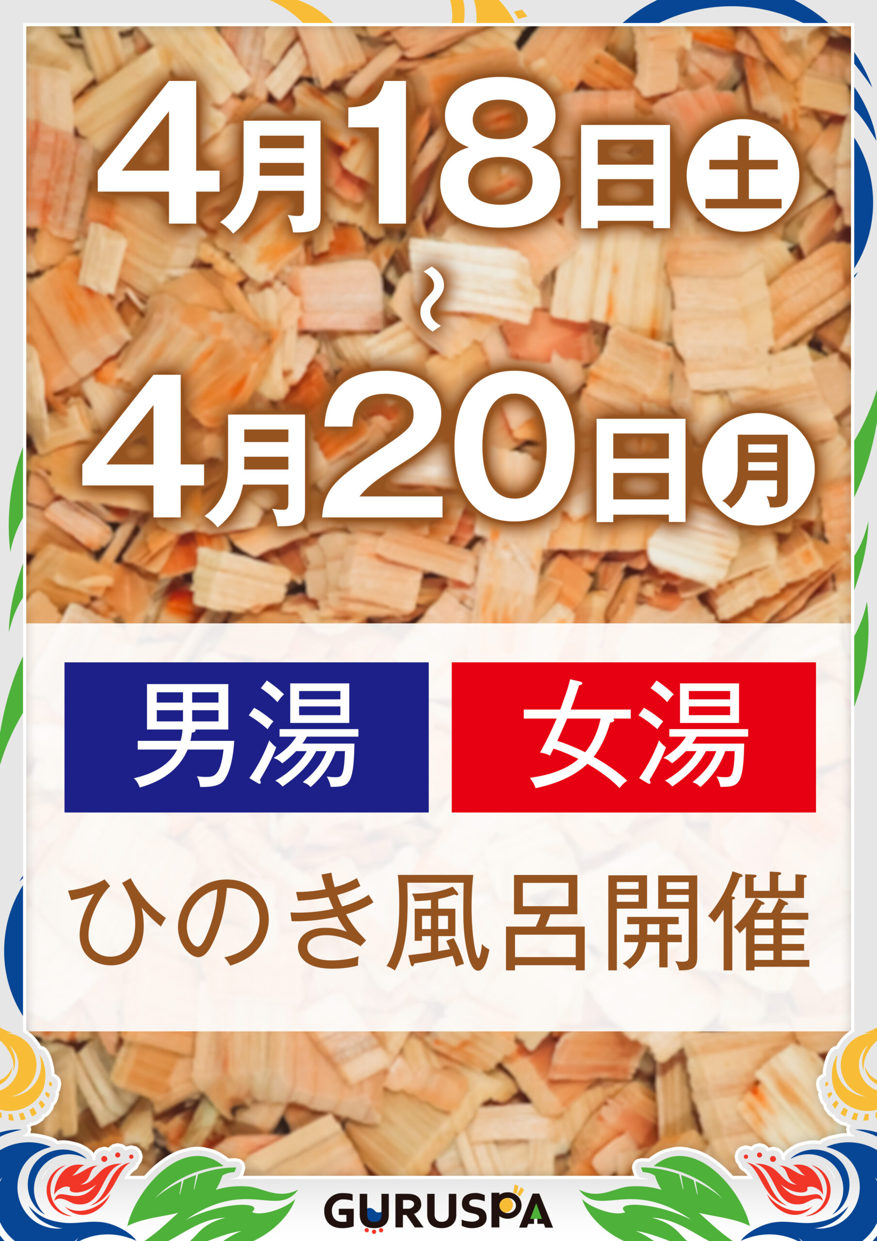 4/18(土)~4/20(月)の3日間、2階男性女性浴場の替わり湯にて、ひのき風呂を開催いたします。