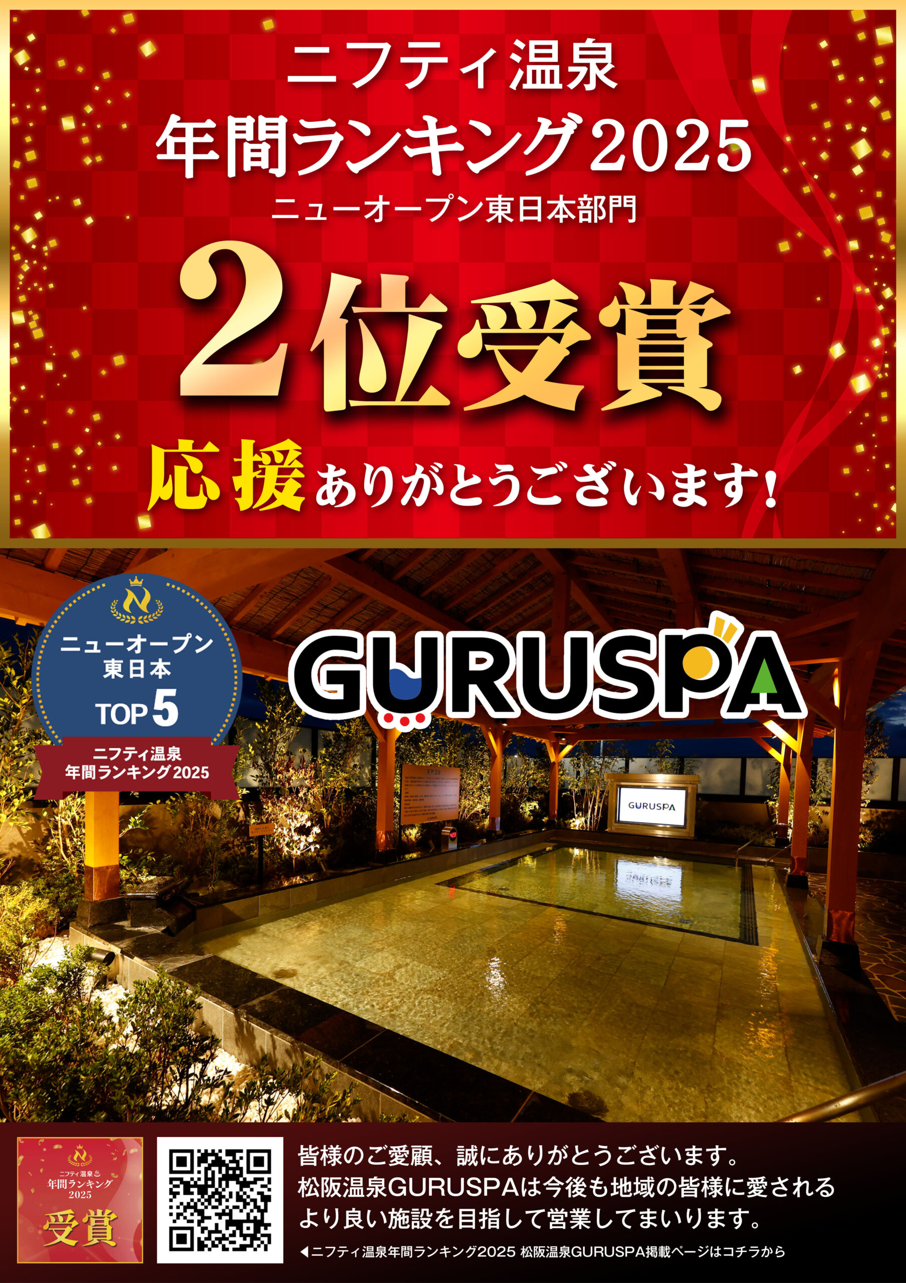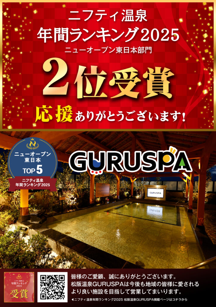 この度、松阪温泉GURUSPA(グルスパ)は、日本最大級の温浴施設情報サイト「ニフティ温泉」が発表する