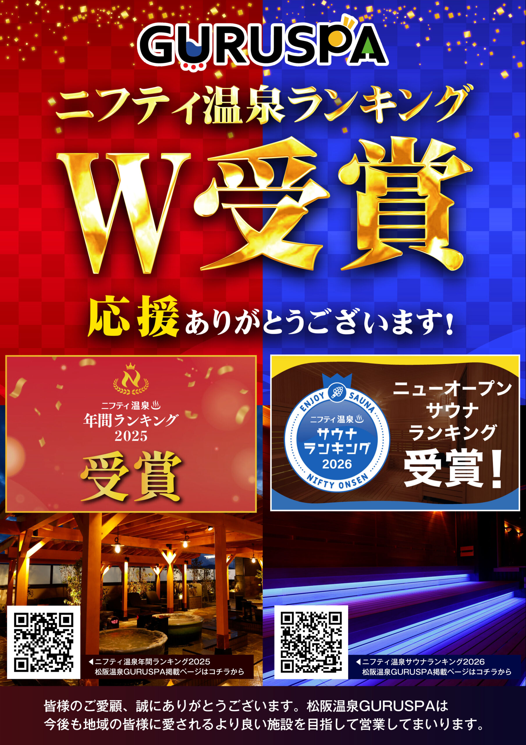 この度、松阪温泉GURUSPA(グルスパ)は、日本最大級の温浴施設情報サイト「ニフティ温泉」が発表する