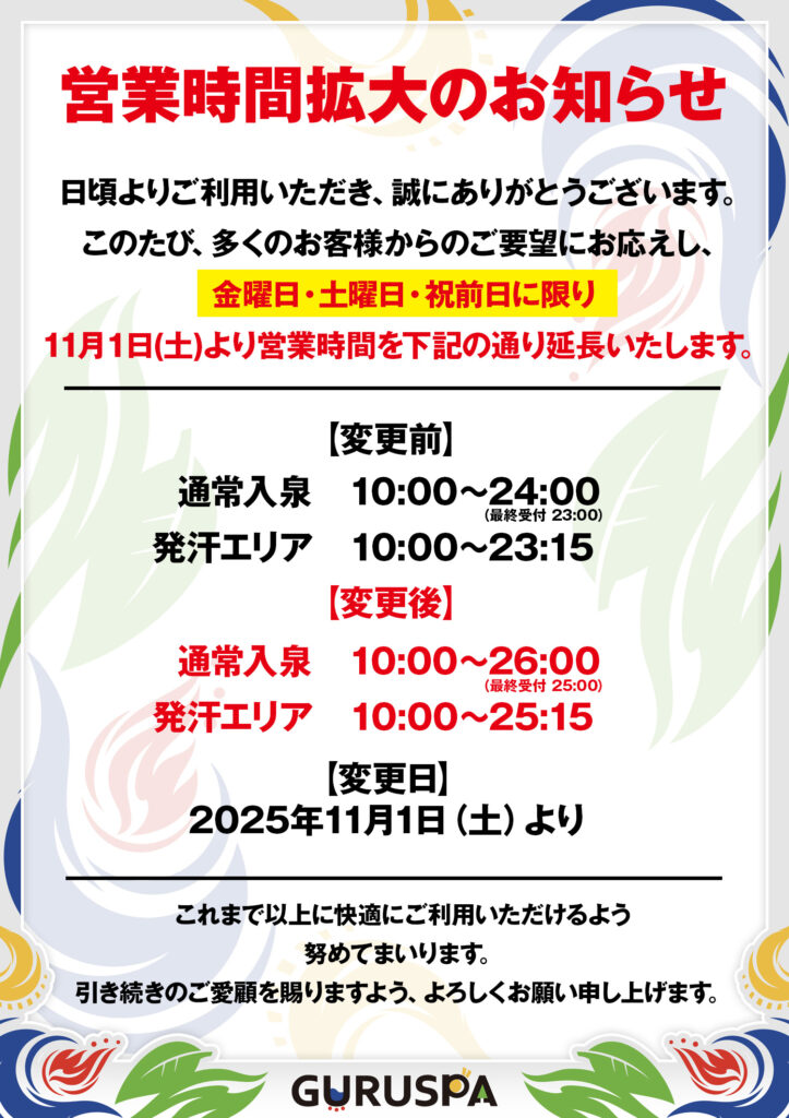 2025年11月1日より、一部営業時間を拡大いたしますので、お知らせいたします。