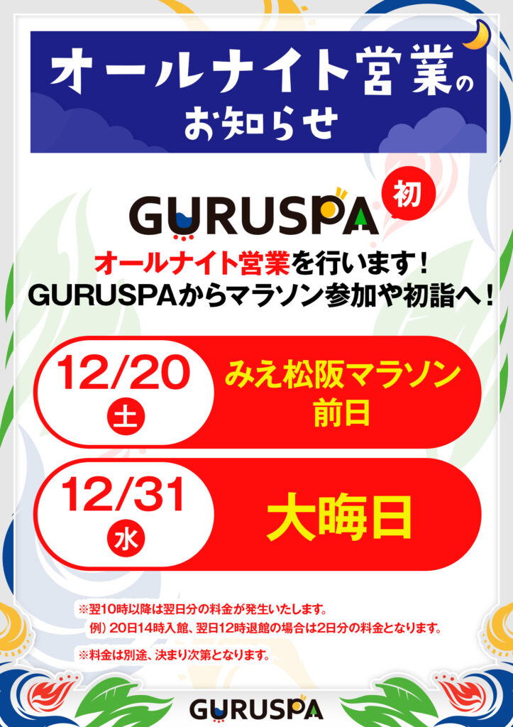 この度、みえ松阪マラソン前日および大晦日に特別にオールナイト営業を実施いたします!