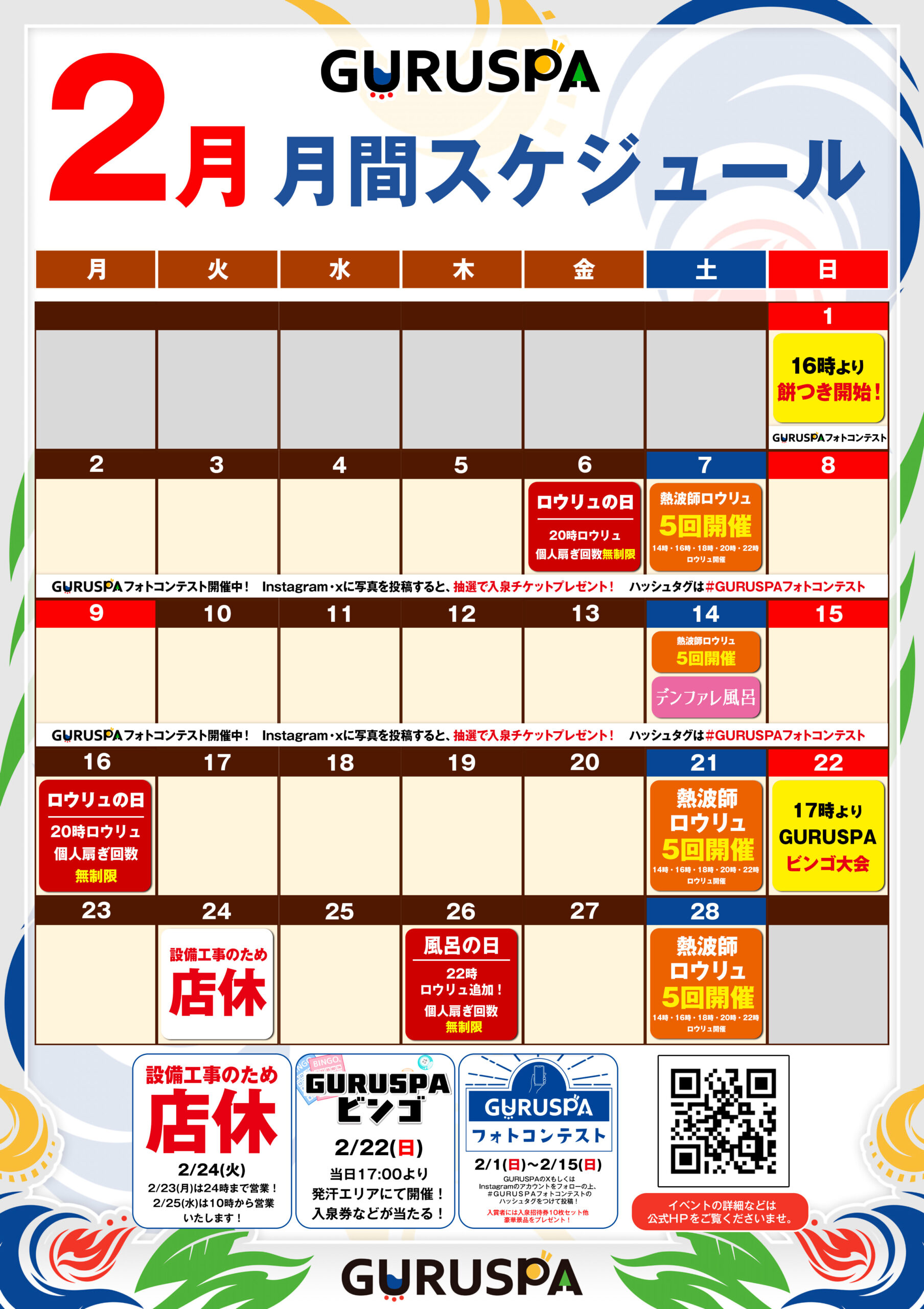お知らせ 2026.02.08 2月月間イベントスケジュール 2月は毎週土曜日熱波師ロウリュ5回開催。 週末の2階男女ロウリュに、ブロワーロウリュが初登場! 灼熱の爆風を、どうぞお楽しみください。 お知らせ一覧へ戻る
