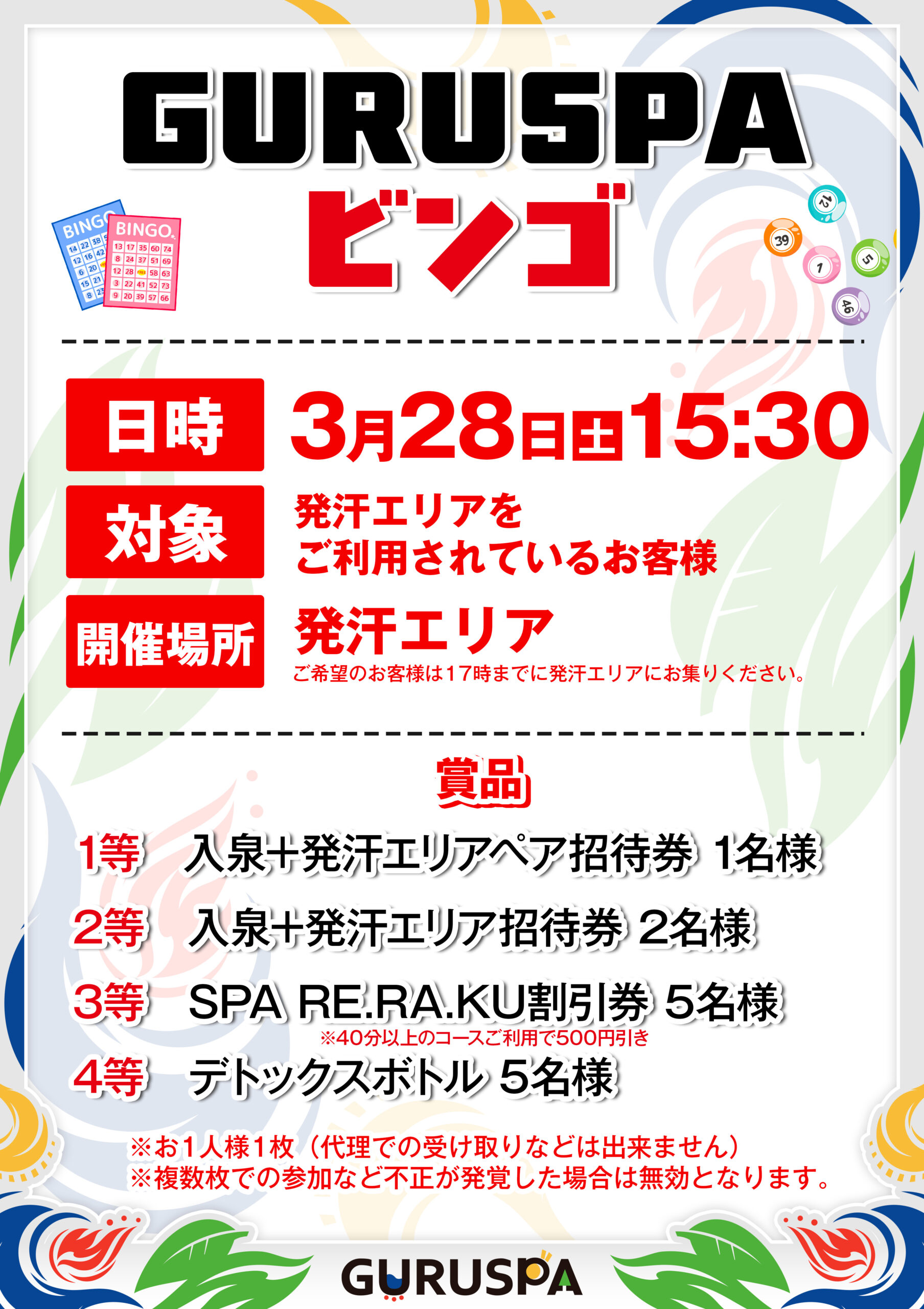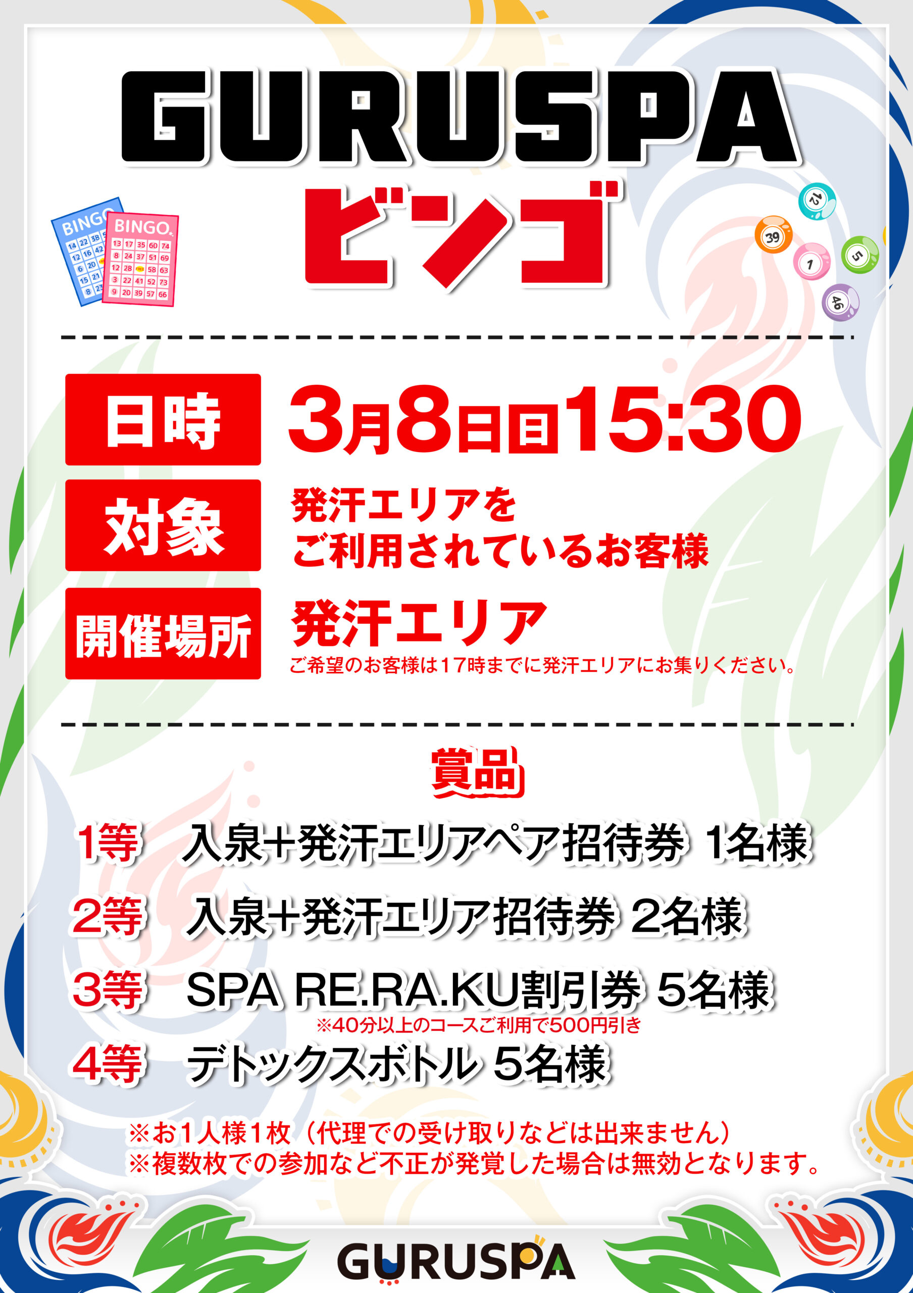 お知らせ 2026.03.08 3月ビンゴ大会スケジュール 3月のビンゴ大会スケジュールです。 今月はなんと4回開催いたします。 この機会に是非グルスパ発汗エリアをご利用してみてください! お知らせ一覧へ戻る